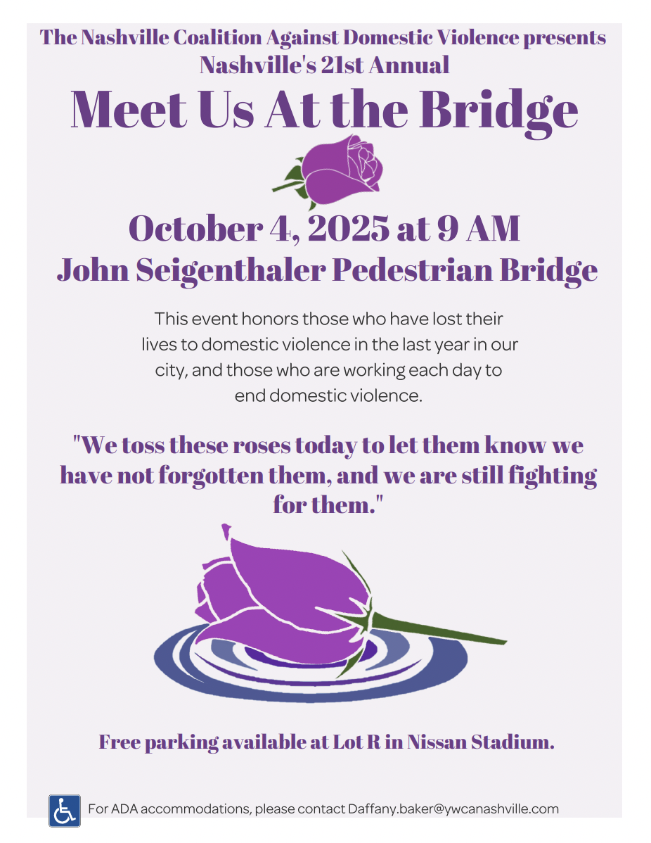 Meet Us at the Bridge is held in October during Domestic Violence Awareness Month and is typically held on a Saturday at 9:00 a.m. on the west side of the John Seigenthaler Pedestrian Bridge. There will be free parking available to event attendees in Nissan Stadium Lot R.